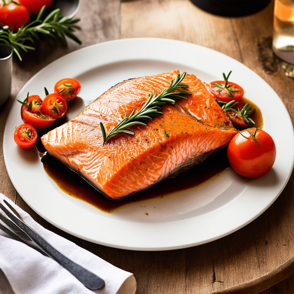 A magazine quality shot of a delicious salmon steak, with rosemary and tomatoes, and a cozy atmosphere