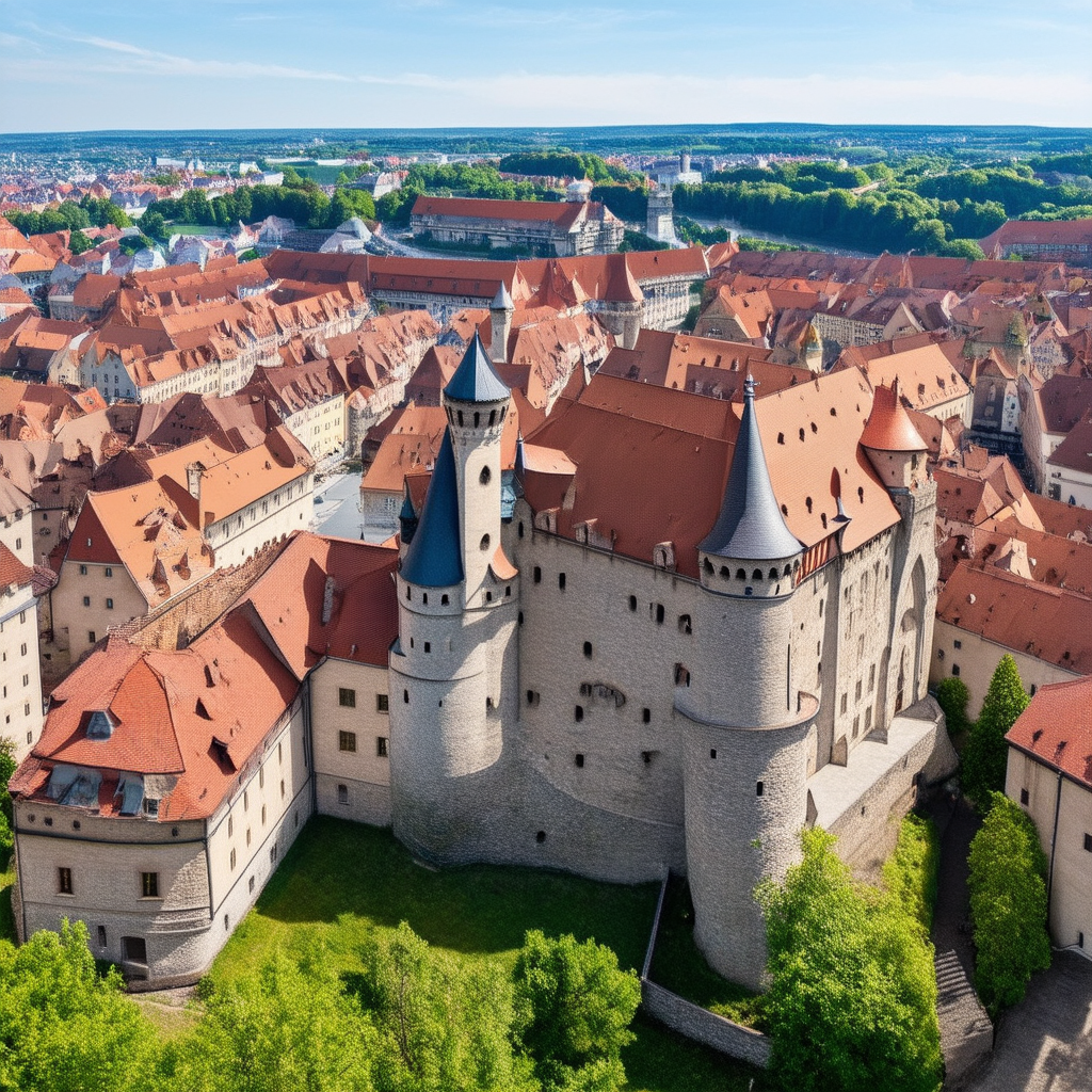 Wide angle shot of Český Krumlov Castle with the castle in the foreground and the town sprawling out in the background, highly detailed, natural lighting