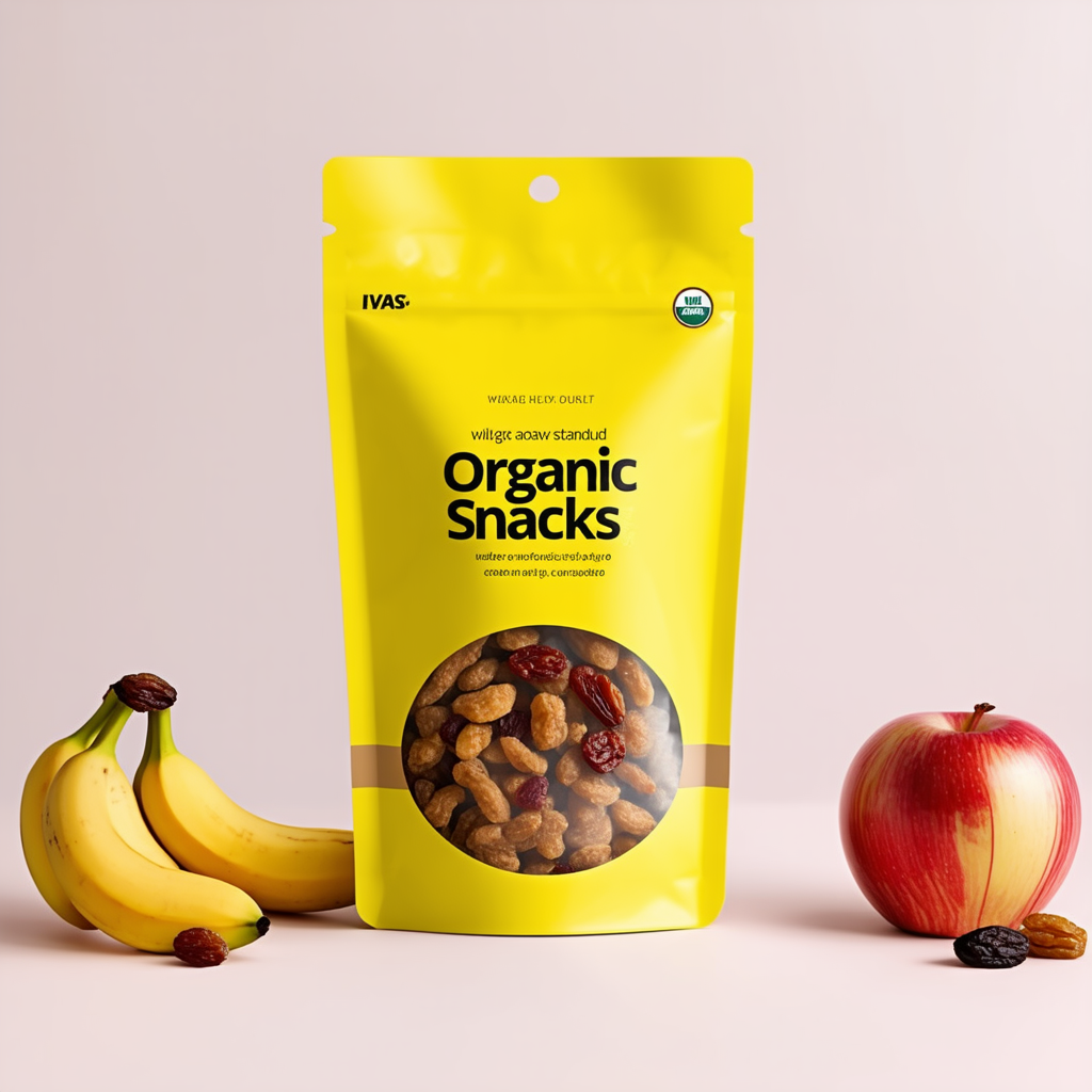 A realistic standup pouch product photo mockup decorated with bananas, raisins and apples with the words "ORGANIC SNACKS" featured prominently