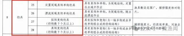 一共4类钓具被列入到了名录当中,包括拟饵复钩钓具(钓钩数7个及以上)和真饵复钩钓具(钓钩数7个及以上)。