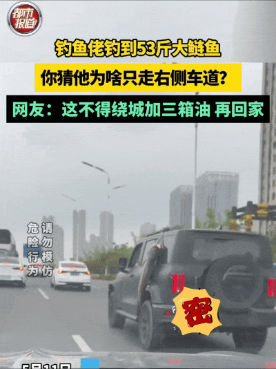 为了炫耀这一战果,钓鱼男子突发奇想,竟然将大鱼绑在车尾招摇过市。当男子驾车行驶在市区时,他的行为已经成功吸引到了网友们的关注。