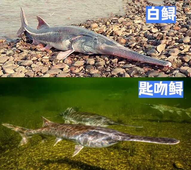 白鲟的吻像圆木棍一样,匙吻鲟的吻则更为扁平,就像鸭嘴一样。一个嘴巴是圆的,另一个是扁平的,这一点应该很好分辨。