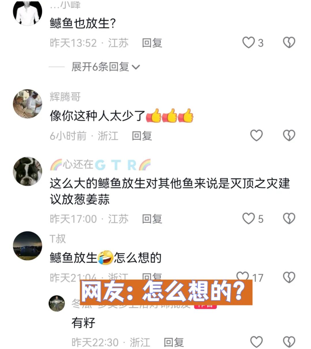 看到钓友把大鱼放生的画面后,评论区质疑声不断。“这么大的鱤鱼放生,对其他鱼类是灭顶之灾,建议放葱姜蒜……(意思是吃掉它)”有网友如是说。