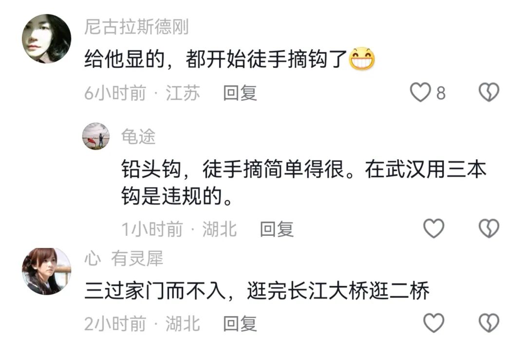 不过,武汉这位钓鱼男子在摘钩的时候显得游刃有余,显然也是钓鱼老手了。钓到这样一条人生“高光时刻”的大鱼,到底该如何展示一下呢?有网友给出建议:三过家门而不入,逛完长江大桥逛二桥。