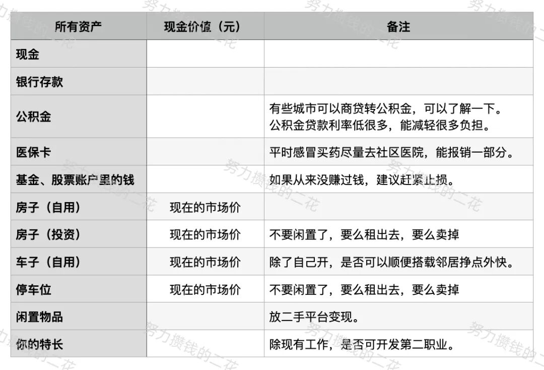 跟上面一样,把自己的资产一一罗列出来,包括现金、存款、金融账户里的钱、车子、房子、你的特长等。