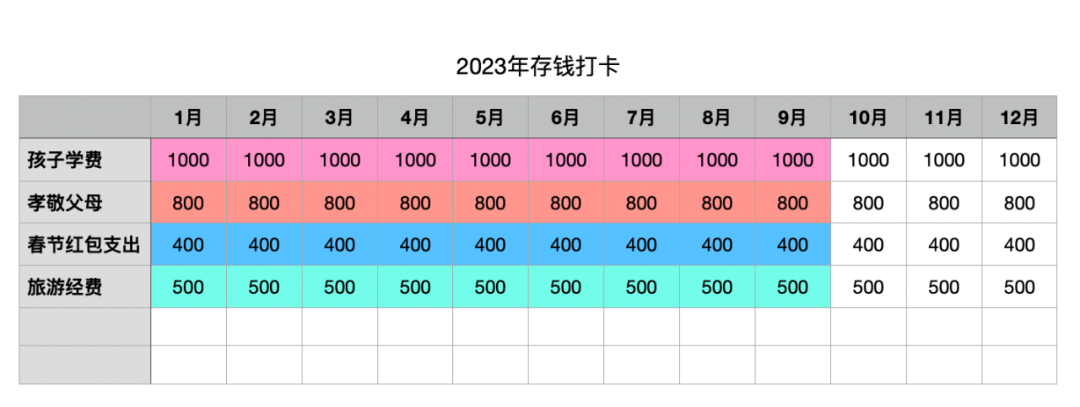 3)孩子的学费、春节红包支出、孝敬父母的钱等,都可以效仿上面这个方法。