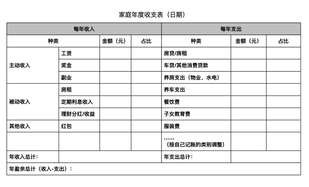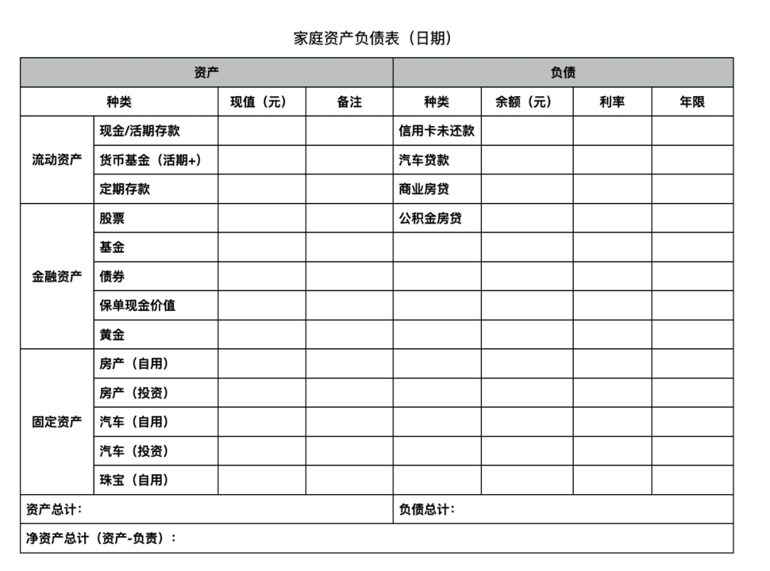 建议大家至少要记账一段时间,然后填写图中的两种表格——家庭资产负债表和家庭年度开支表。