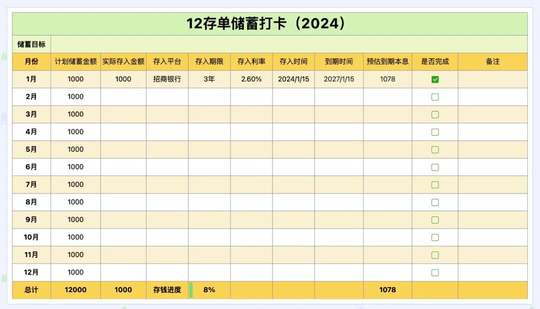 每个月存一笔,一年就会有12张存单,数目比较多,建议每存一笔都用表格记录下来,方便后期的管理。