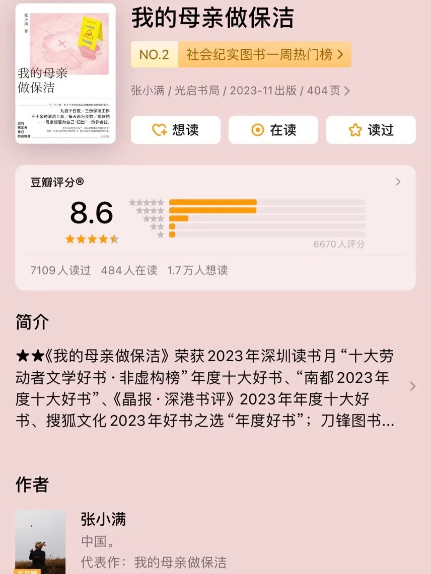 前段时间我读了一本书,张小满的《我的母亲做保洁》。