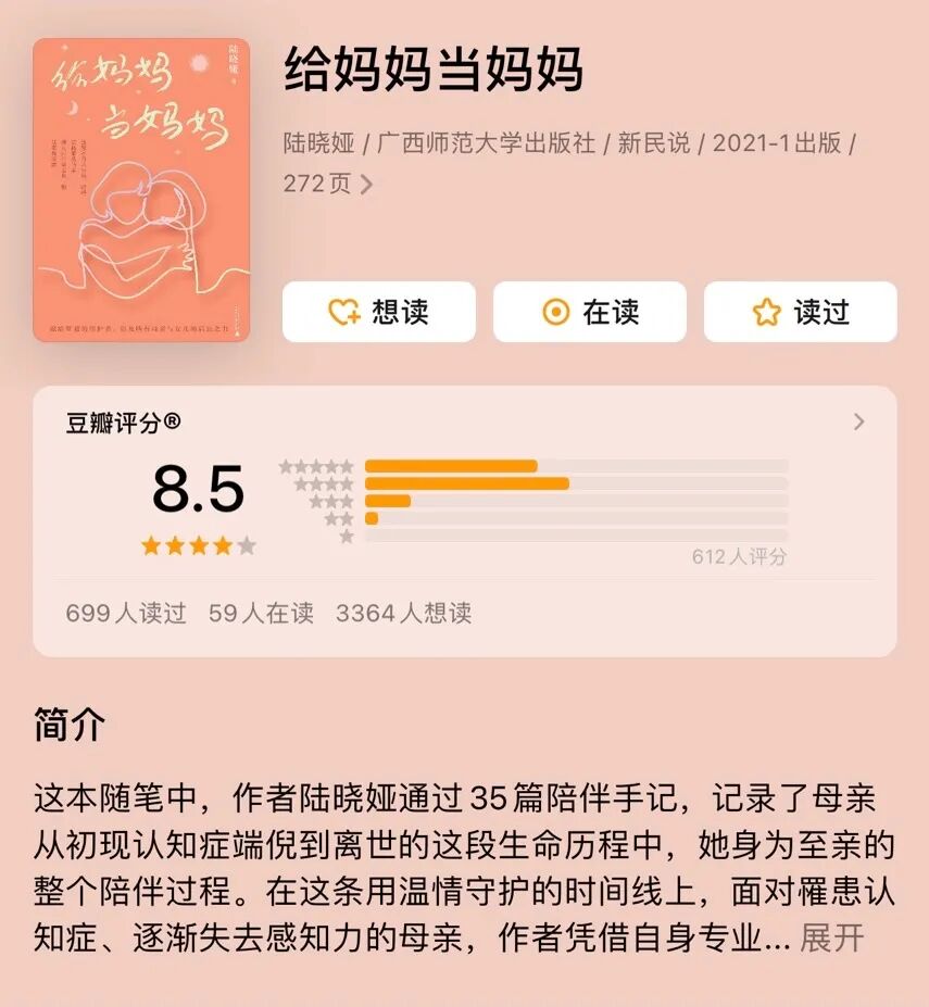 《给妈妈当妈妈》,记录的是她照顾陪伴有认知症的妈妈的生活笔记。