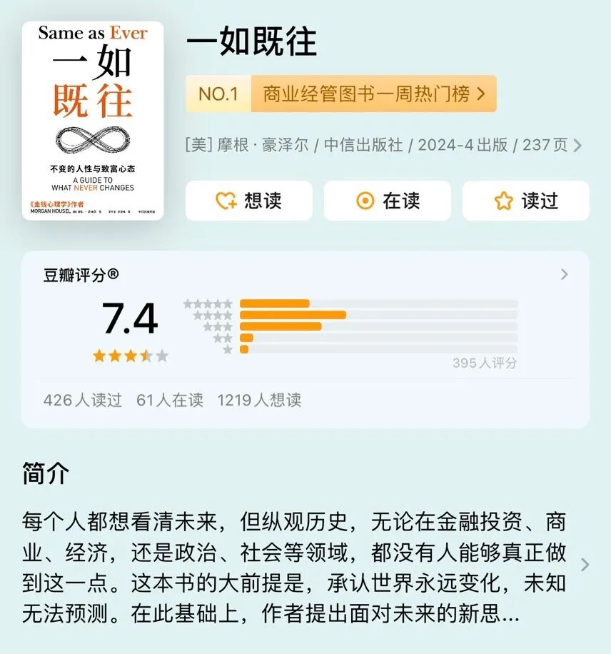 不管是《金钱心理学》还是《一如既往》,作者都在努力研究复杂世界与个人成长中“不变的东西”。
