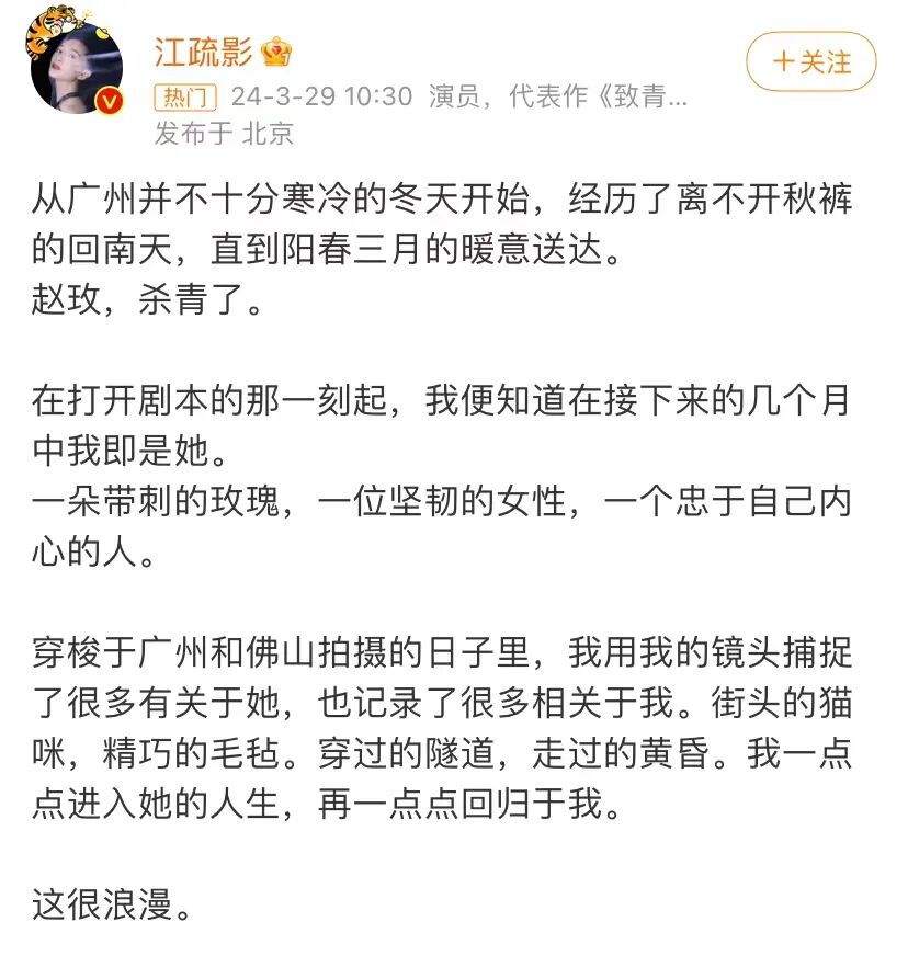 她说新角色,是“一朵带刺的玫瑰,一位坚韧的女性,一个忠于自己内心的人”,这也是属于江疏影自己的浪漫吧。