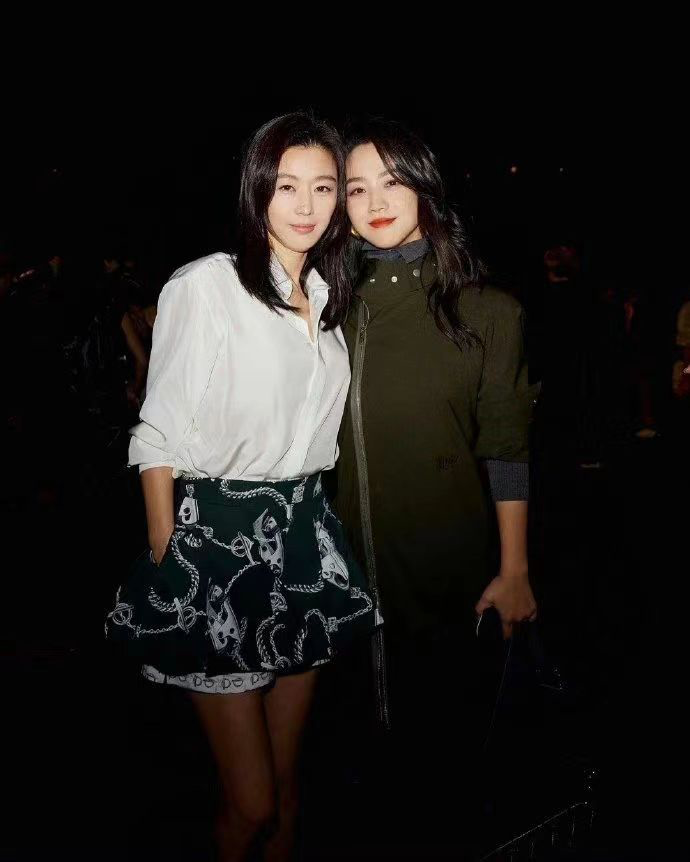 在秀场,和全智贤亲密合照,墨绿色风衣,红唇卷发,干练流利。