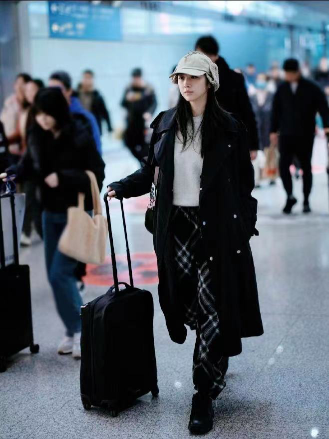 出发时的黑色风衣,格子长裤,一种远行的舒适感。