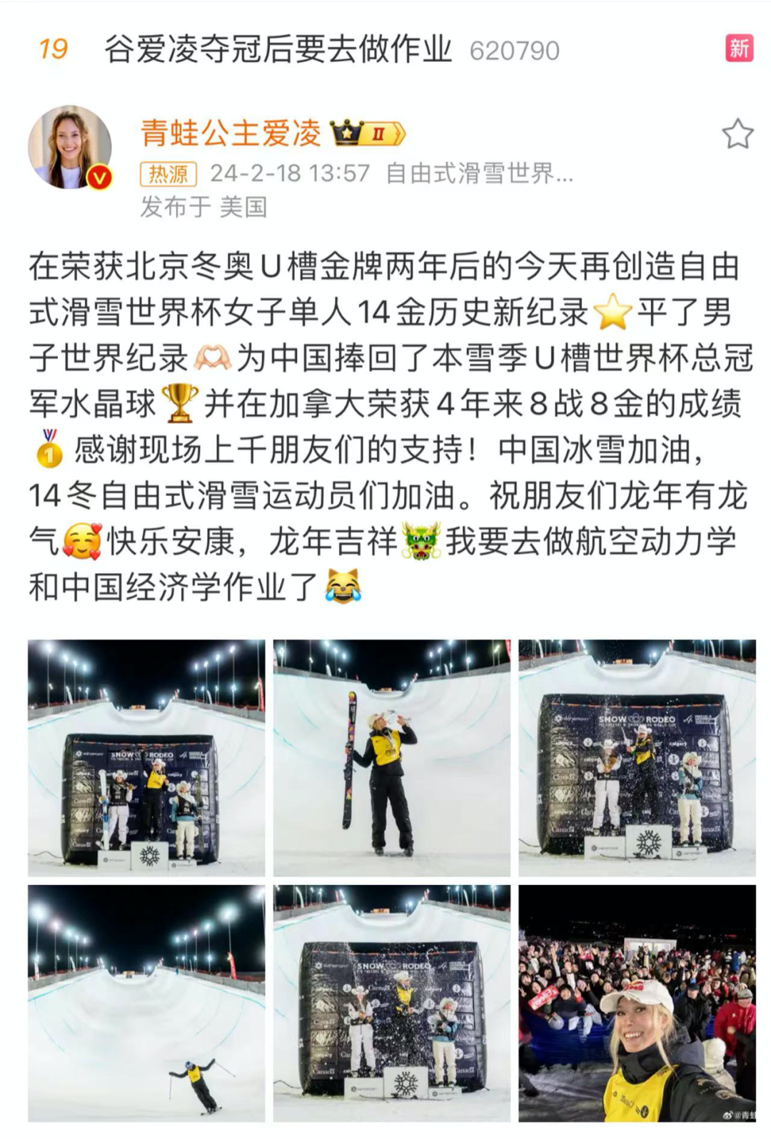 2月18号那天,U型场地世界杯,卡尔加里站(加拿大),第二场决赛,谷爱凌再度夺冠。