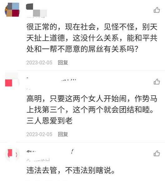 还有一些传闻,他原话是,“我和我太太的感情非常稳固,但也许其他姑娘也早已如同亲人,我甚至希望她们之间能够友好互助和平共处,就是这样。”