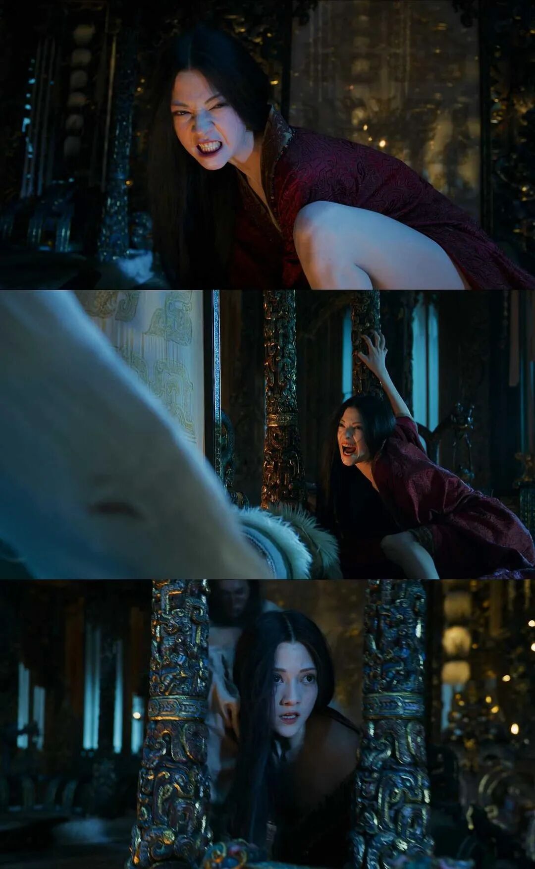 太子去刺杀妲己。妲己穿着红色长衣,身形蹲伏,兽性毕露。她转过一张惨白的小脸,龇牙裂齿,愤怒地咆哮,看到纣王来了,再迅速窜开。
