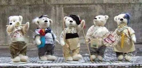 这些布熊以古代人物为原型,穿着各式衣服,西西给它们取名,带它们去旅行,我记得有“黄飞熊”,还有背着竹架的玄奘熊,水浒里的杨志熊,穿着民族服装的范蠡和西施熊……