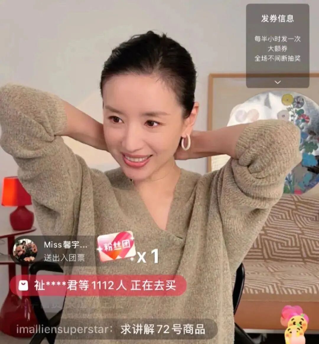 她本来穿了一件蓝色毛衣,仔细讲了透明度,如何内搭,站起来给大家看效果。又轻轻问了声,“要不要穿一下米色?”后来又换上米色和大家聊。