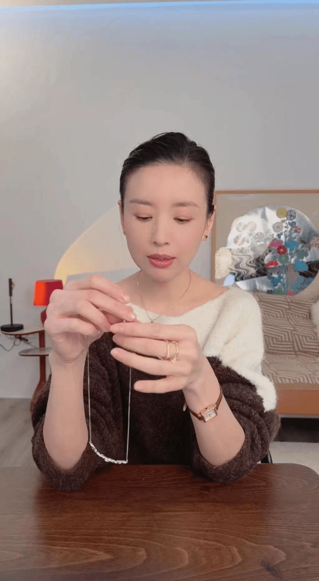 一款项链,她戴上之后说,“这款配针织偏长了,我还是认真给大家作一些好的搭配”。