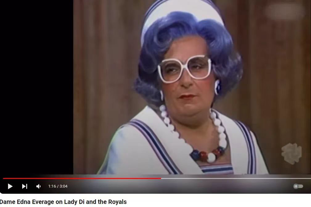这个Dame Edna,是一个笑星创作出的一个喜剧人设(类似周星驰创作出周星星……),设定里,Dame Edna深谙政坛和王室内幕,有个段子说的是,采访时黛安娜王妃给她塞了“HELP”的纸条……