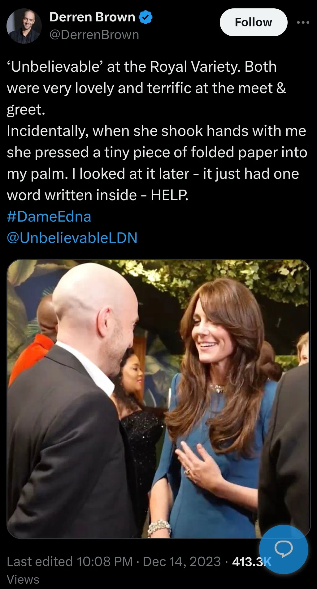 “顺便说一下,当她(凯特王妃)和我握手时,她把一张小纸条摁到了我手心里,我后来打开一看,上面只写着一个词:救命(HELP)”