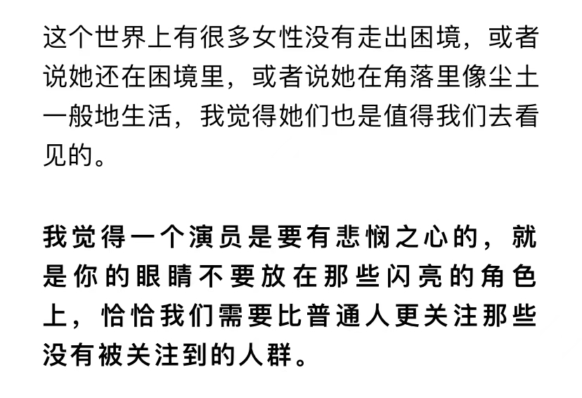 “我觉得一个演员是要有悲悯之心的……我们需要比普通人更关注那些没有被关注到的人群。”