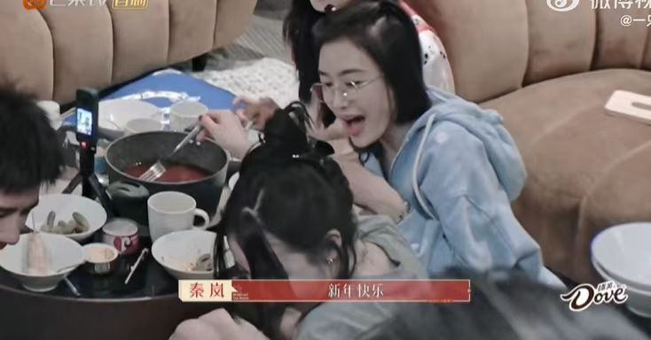迪丽热巴不小心碰倒可乐,场面一度尴尬,秦岚笑咪咪地凑近她说,“新年快乐!”