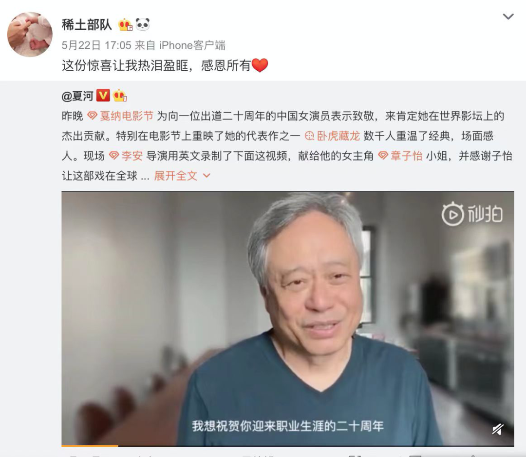 戛纳还为《卧虎藏龙》举行重映,放映前,播放了李安特意录制的祝贺视频。