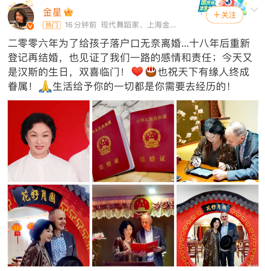 昨天,金星宣布和丈夫汉斯,重新登记领证(因为领养小孩的落户问题曾离婚)。
