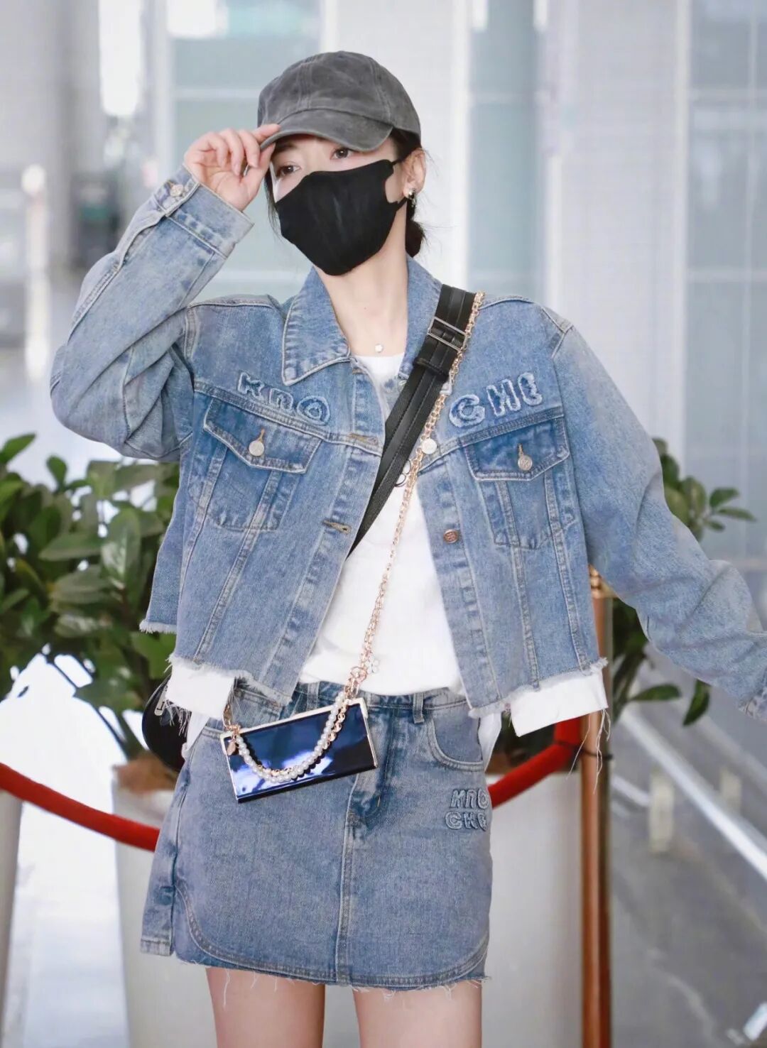 上半身的穿搭尤为出彩,她选择了一件短款浅蓝色牛仔毛边外套,既展现了纤细的腰身,又不失时尚感。内搭的白色长袖稍稍比牛仔衣长出一些,营造出层次感,显得既随性又不失优雅。用手往镜头打招呼,引人注目的是,陈紫函在配饰上也下足了功夫。