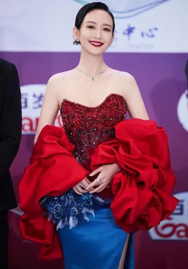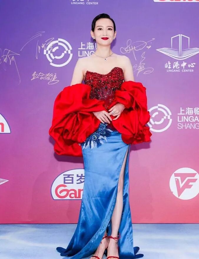 42岁王鸥产后浮夸亮相,一袭红蓝礼裙俗不可耐,张扬又高调!
