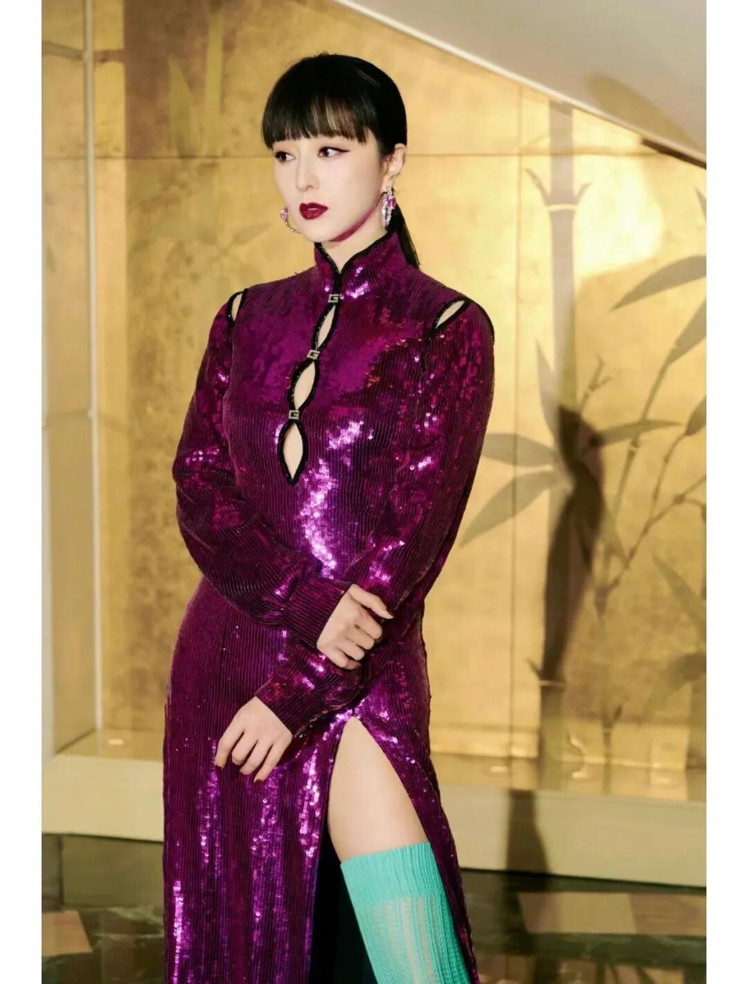 范冰冰久违的杀马特新造型重出江湖了,一袭紫色长袍混搭绿色过膝袜,简直就是美神降临的最好诠释。