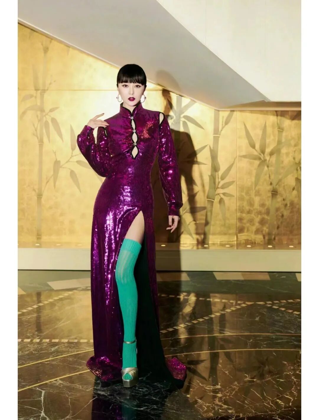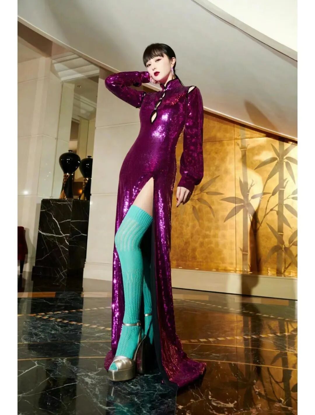 范冰冰混搭造型重出江湖,一袭紫衣绿袜,腰臀白到反光!
