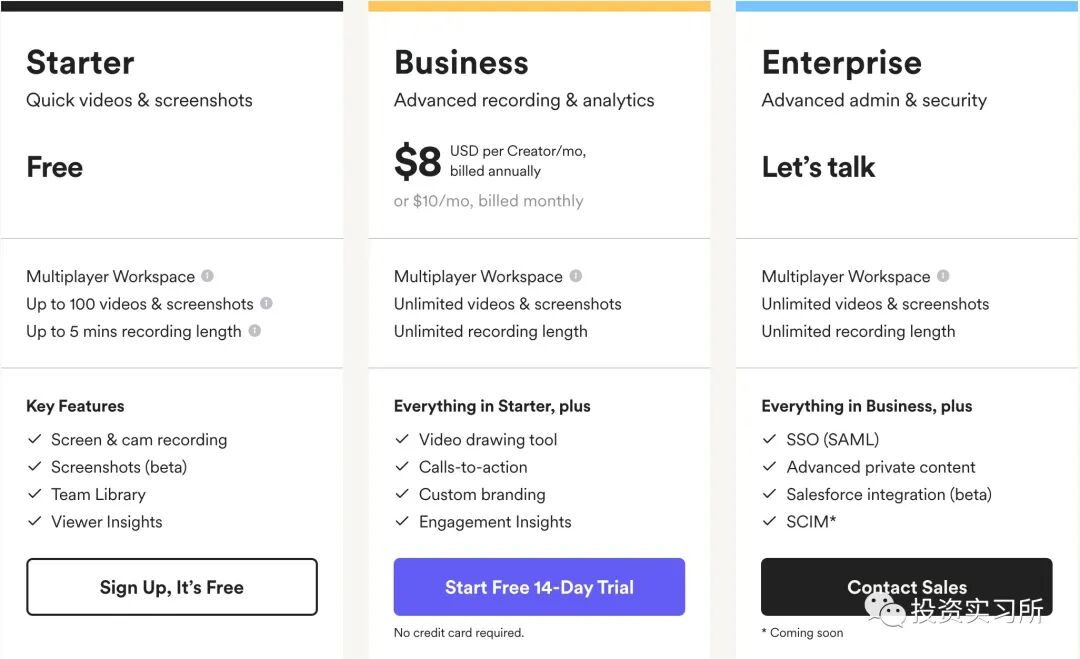 而今,其定位更加的精准:Video messaging for work,可以说直接瞄准的就是工作场景,并且已经推出了付费版本,最基础的录屏和视频拍摄免费外,如果要使用更多的功能就要进行付费了,最低是8美元每人每月。