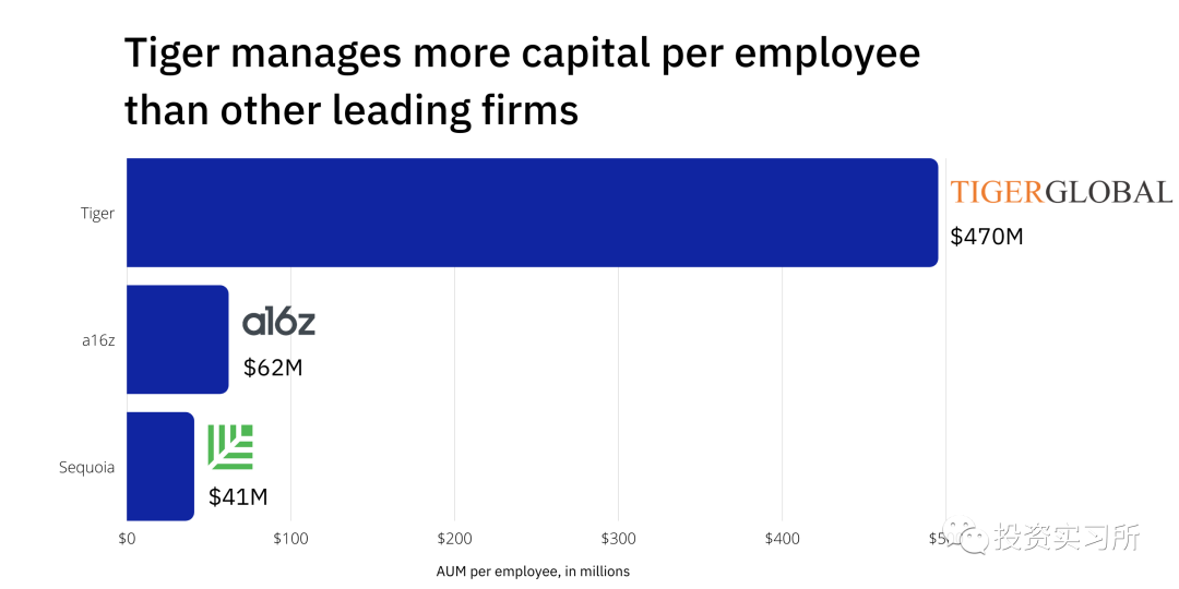 如果你只看老虎的数字,你会认为答案是大约 200人。LinkedIn 上的数据告诉我们有 188人在该基金工作,有效地管理着 930 亿美元。这样算下来,每个员工管理的资产几乎达到了 5 亿美元。其他领先的风险投资机构无法达到这种效率。