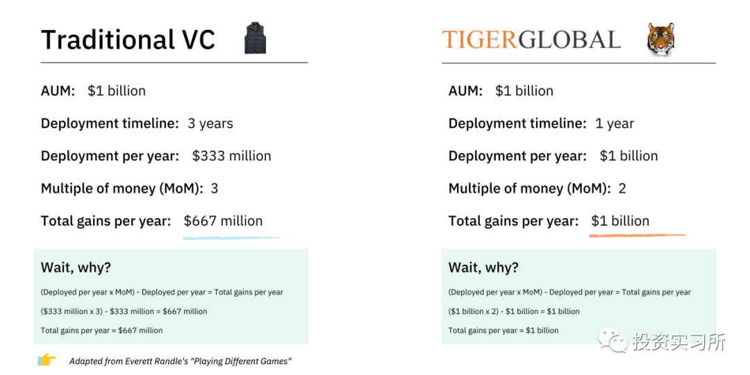 在风险投资中,有不同的获胜方式。正如 a16z 在十年前所做的那样,老虎已经扰乱了风险投资市场,展示了一种新的获胜方式。它的方法是以资本的快速分发为前提,减少创始人的摩擦,并接受较低的回报率。