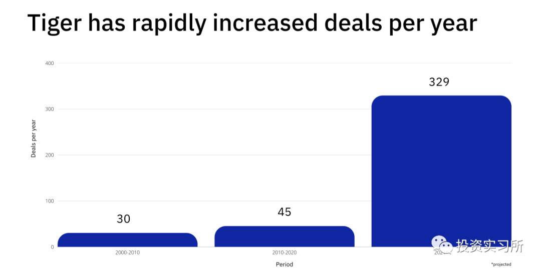 老虎能够做到这一点,也是由于其模式的原因。它有足够的空间以较低的回报门槛进行更频繁的投资,并且通常在正式开始接触之前就已经收到了外包咨询公司做的尽调报告。这位企业家说,在他与老虎团队的第一次通话中,很明显他们 "完全知道自己想要什么"。