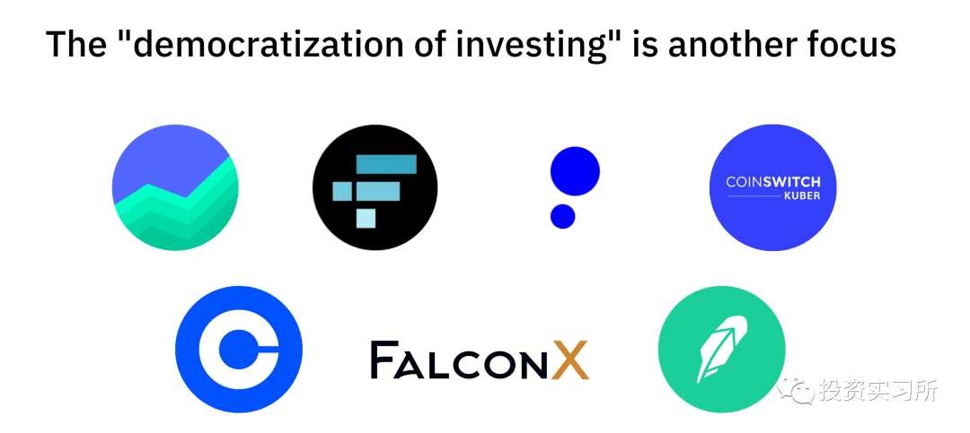 另一个明显感兴趣的领域是 "去中心化投资",包括传统股票和加密货币。老虎已经投资了 Groww、FTX、Public、CoinSwitch、Coinbase、Falcon X 和 Robinhood。