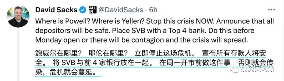 如果这块不能得到解决的话,那影响将是非常非常严重的,下周可能很多创业公司就没办法支付很多账单了,下个月这些公司肯定也没法支付员工工资了。Craft Ventures 创始合伙人 David Sacks 呼吁美国政府部门立即解决这个问题,否则危机会快速蔓延。