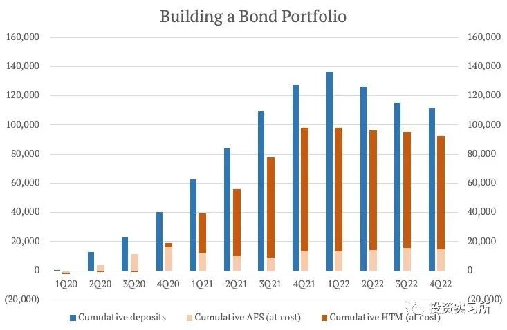 银行将这些存款的大部分投资于证券。它采取了双管齐下的策略:在较短期可供出售证券中保护一些流动性,同时通过持有到期日更长的债券来寻求收益。从成本角度看,较短期可供出售证券组合从2019年底的139亿美元增长到2022年第一季度峰值的273亿美元;而持有到期日更长债券组合则增加得更多:从138亿美元增至987亿美元。其中一部分增加反映了将88亿美元的证券从可供出售转移到持有到期日更长债券组合中,但大部分是市场购买所致。