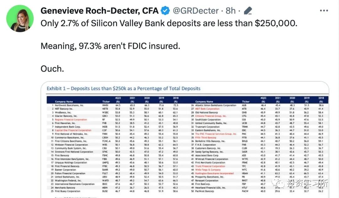 虽然现在被 FDIC(美国联邦存款保险公司)接管,客户每个账户可以获得 25 万美金的保险资金,不过根据最新披露的信息,存款低于 25 万美金的客户只有 2.7%,也就是 97.3%的客户在硅谷银行存的钱都高于 25 万美金,比方说像 Roku 这一家公司其 19 亿美金的 26%都放在了硅谷银行,这也说明了硅谷银行的客户是多么的优质,真真可惜了。