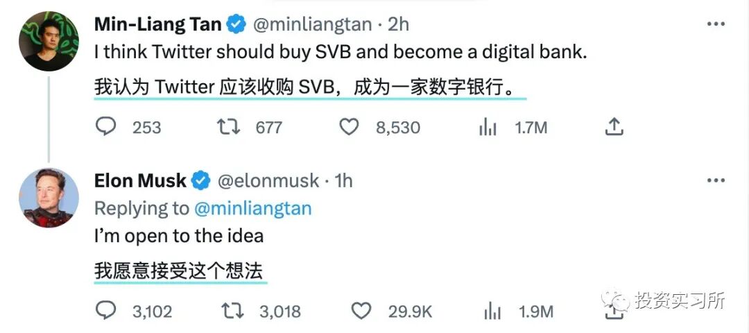 最新消息,有人建议马斯克的 Twitter 应该收购硅谷银行成为一家数字银行,马斯克回应说对这个想法持开放态度。
