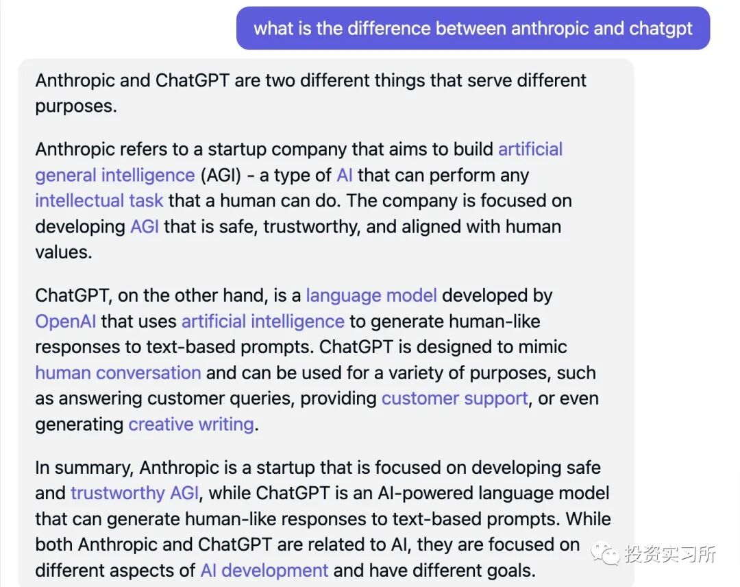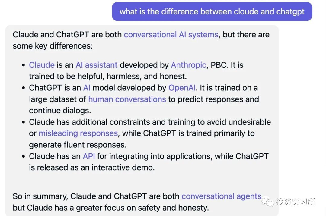 相比于 ChatGPT,Claude 最大的优势在于准确性,就它们的区别,我分别问了一下 Claude 和 ChatGPT,给出的答案都比较类似,其中 Claude 经过训练以成为有用、无害和诚实的工具,ChatGPT 则是通过大量人类对话数据集进行训练,以预测响应并继续对话。另外 Claude 具有额外的限制和培训,以避免不良或误导性回复,而 ChatGPT 主要受到流畅回复生成方面的训练。下面是 Claude 给出的回答: