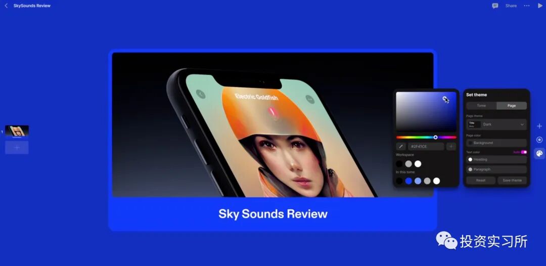 Lightspeed 合伙人 Michael Mignano 还用 Tome 做了一个非常炫的关于此次投资的 PPT,其体验效果和制作效率和传统 PPT 完全不在一个层级,Michael 认为 Tome 能如此快速的创建这么高质量的结果让他感到震惊,而且它是一种比以往任何演示文稿格式都更现代化的一种格式。