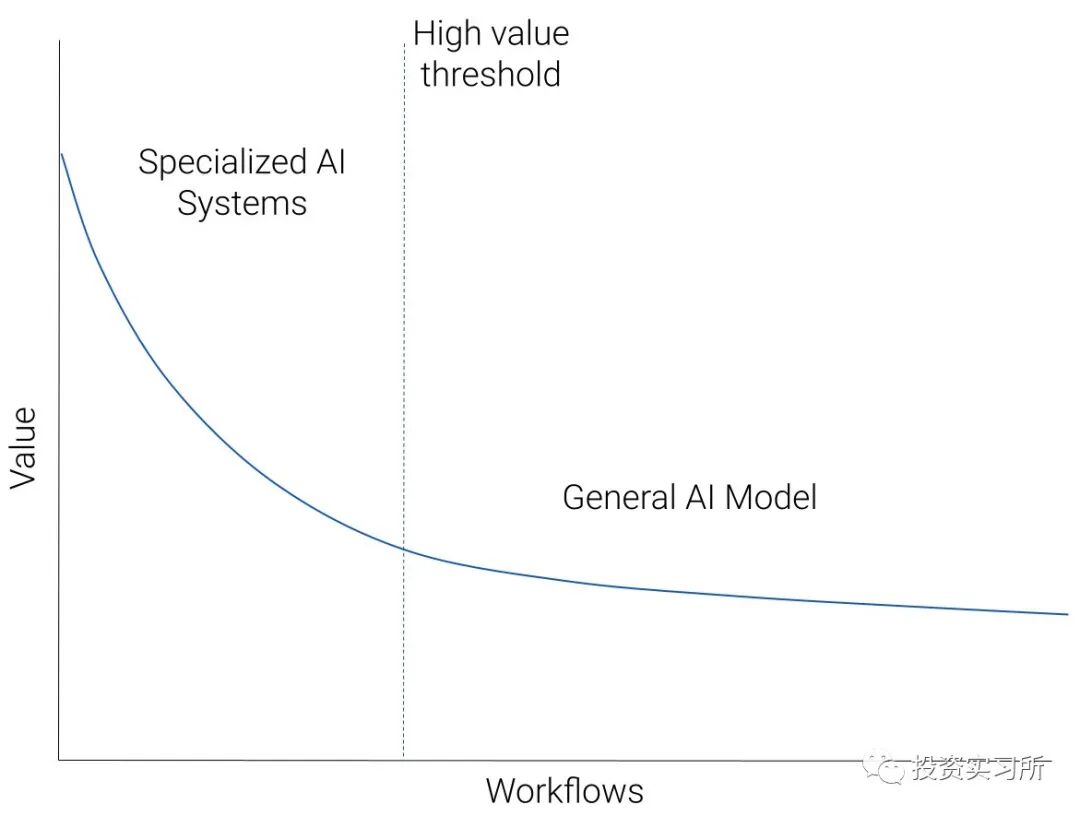 我们预测,图中的左上角(高价值的工作流)将由专门的人工智能系统主导,而当我们沿着蓝色曲线向下移动到低价值的工作流时,通用人工智能模型将成为主导统治地位。