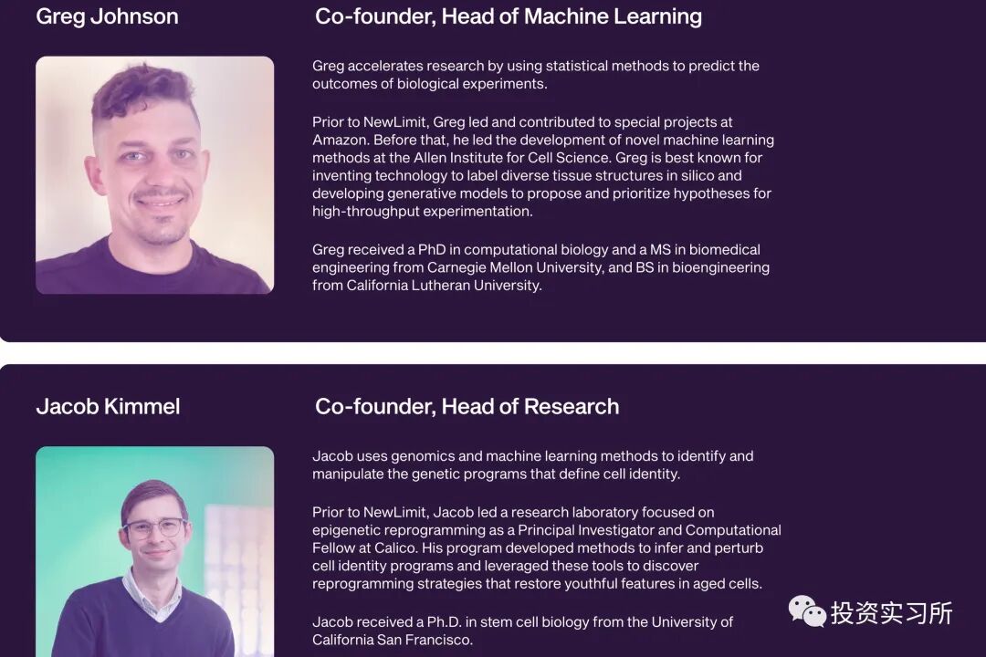 NewLimit 创立于 2021 年年底,目前 17 名员工,并且会长期保持一个小团队的运作模式,因为他们认为这样每个人都能为公司带来巨大的贡献。尽管有 4 位联合创始人,但是目前没有 CEO,用 Blake Byers 的话说就是,NewLimit 还处于非常早期的阶段,目前创始团队工作配合的非常好,所以还完全没有去想这个事情,不过公司的日常运营主要由另外两位联合创始人 Greg Johnson 和 Jacob Kimmel 主持,其中 Greg Johnson 还兼任机器学习的 Head,Jacob Kimmel 则负责研究。
