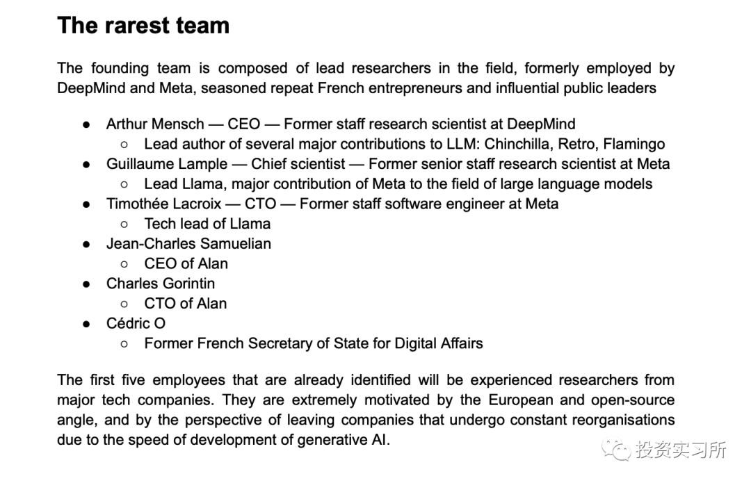 同时,Memo 里首次介绍了 Mistral AI 的整个团队成员,目前 6 个人。如之前所说,其 CEO Arthur Mensch 之前是 DeepMind 的高级研究科学家,他是 Retro、Flamingo 和 Chinchilla 项目的主要贡献者,积累了优化大型语言模型的宝贵经验;而首席科学家 Guillaume Lample 和 CTO Timothée Lacroix 在 Meta 共同领导了 LLaMa 大模型的开发。