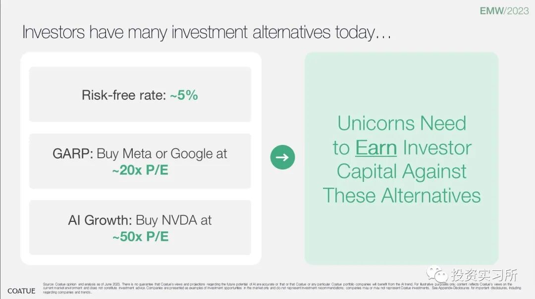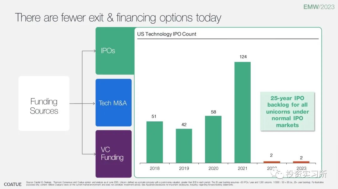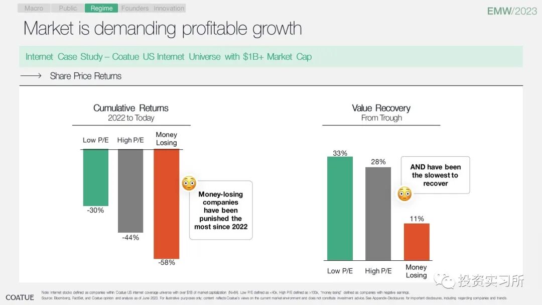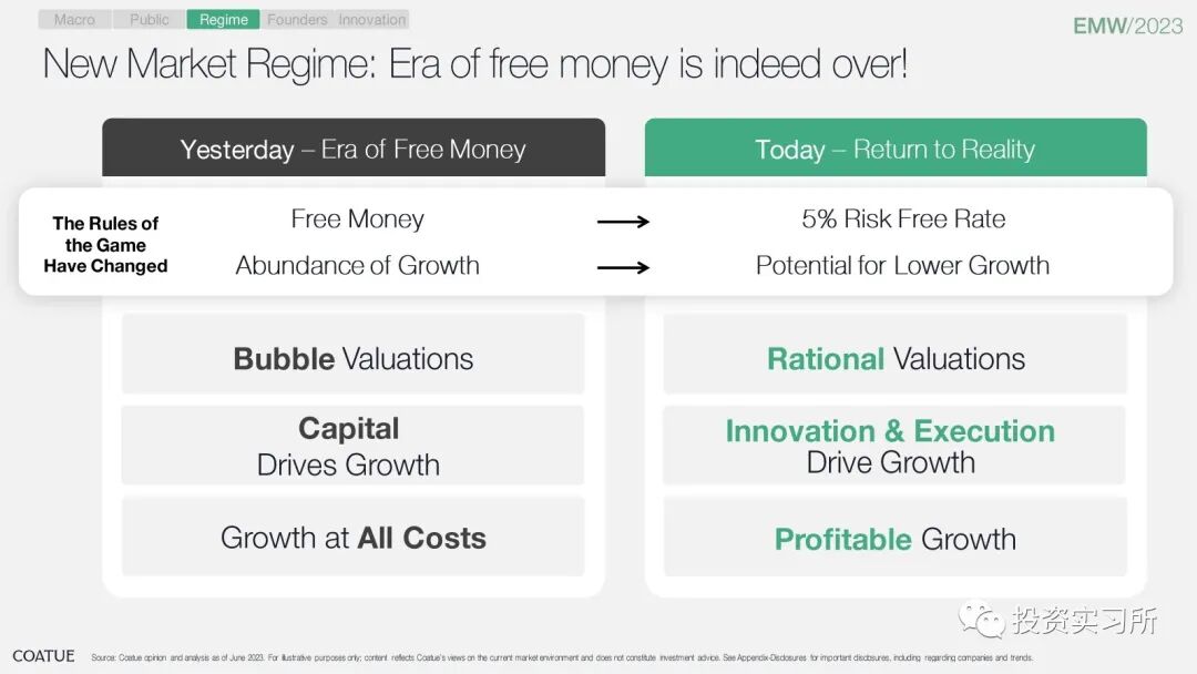 在一级市场,这张 PPT 几乎把目前的市场情况总结的非常清晰了:免费便宜资金的时代已经结束,估值从泡沫回归理性,资本驱动增长转向创新和运营执行驱动,并且增长方式从不计成本追求增长回归到以盈利为目标的增长