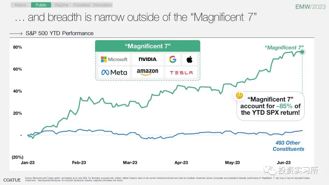 并且,这里的所谓科技领域,主要受益者为微软、英伟达、Google、苹果、Meta、amazon 以及 Tesla 这 7 家巨头企业,Coatue 将其定义为Magnificent 7,它们占据了整个收益的 85%。